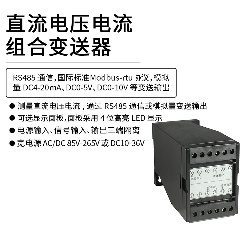 HY194-BS5U(HY194-BS5I)直流電壓(電流)變送器,是一種將直流電壓(電流)信號隔離轉(zhuǎn)換成線性直流模擬信號輸出或RS485數(shù)字通信接口輸出。模擬量輸出最多可選2路輸出,2路模擬量輸出之間互相隔離,模擬量可選:DC0~20mA、DC4~20mA、DC0~5V、DC1~5V、DC0~10V等變送輸出。RS-485數(shù)字通訊接口,采用國際標(biāo)準(zhǔn)MODBUS-RTU通訊協(xié)議,可與各種PLC、HMI、組態(tài)軟件實現(xiàn)組網(wǎng);可選顯示面板,面板采用4位高亮LED 顯示,并帶有3個按鍵用來進(jìn)行參數(shù)設(shè)置。