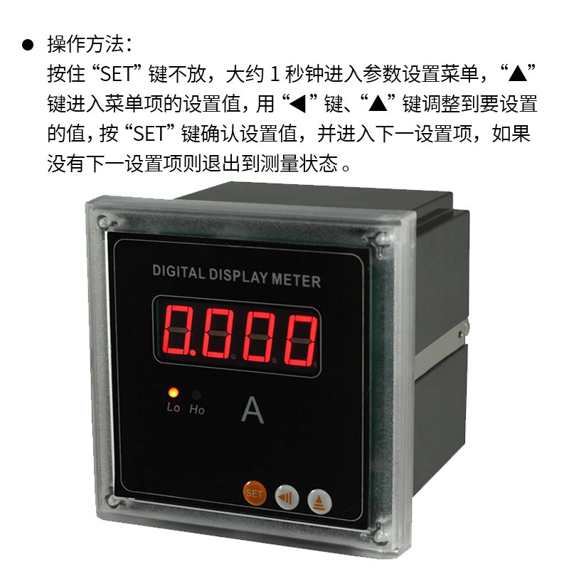 按住“SET”鍵不放,大約1秒鐘進入參數設置菜單,“▲”鍵進入菜單項的設置值,用“?”鍵、“▲”鍵調整到要設置的值,按“SET”鍵確認設置值,并進入下一設置項,如果沒有下一設置項則退出到測量狀態。