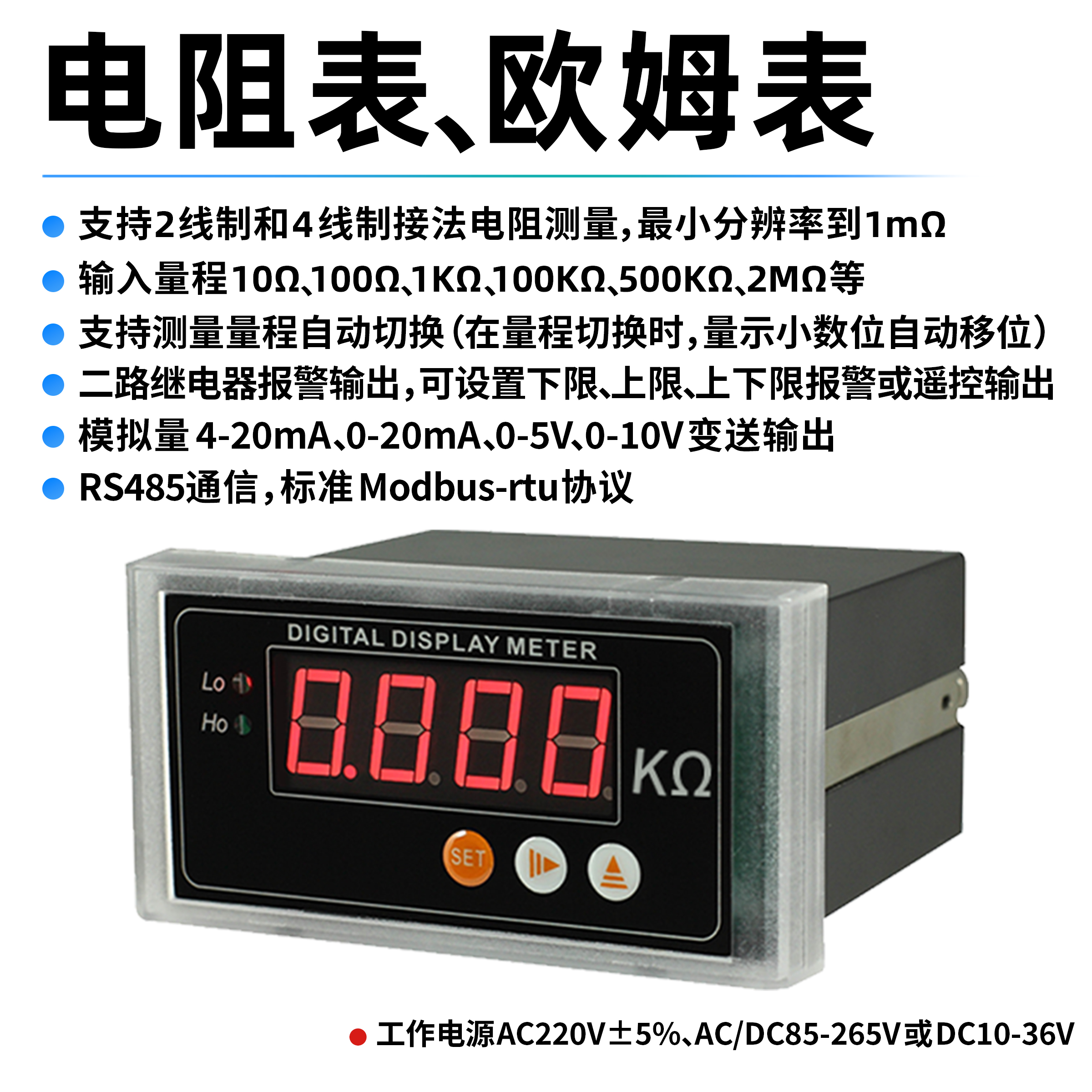 舉例:電阻表,帶2路繼電器報警輸出,RS485通信,工作電源DC10~36V,型號為:HY655R-S1-R-A2-P3。