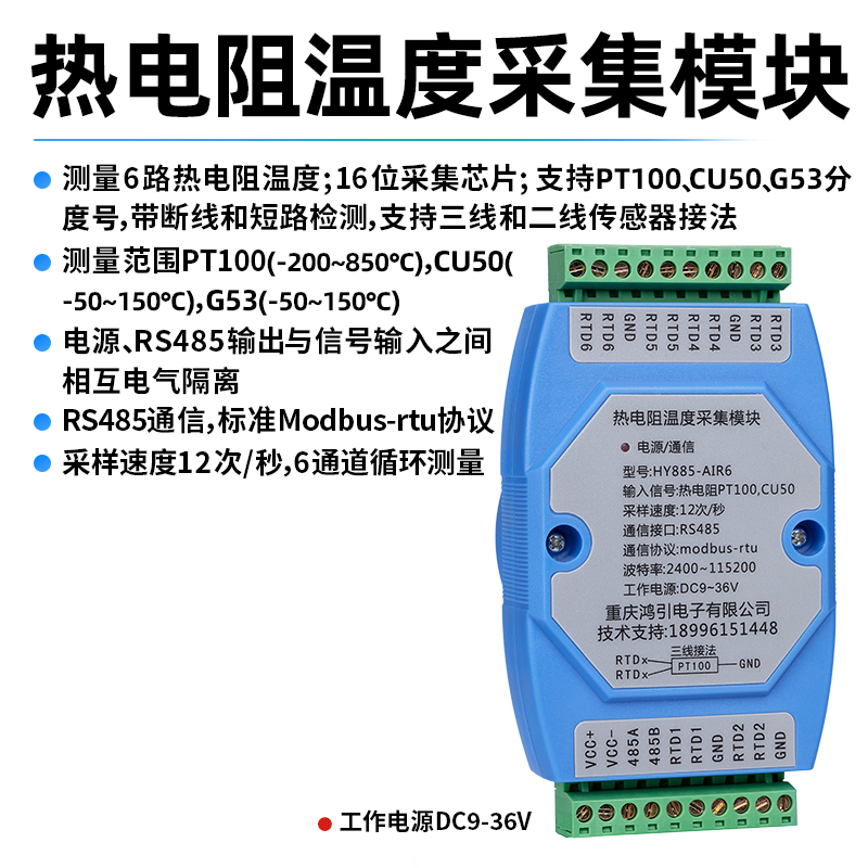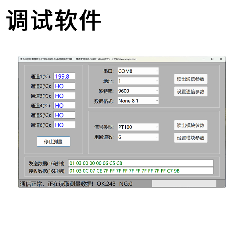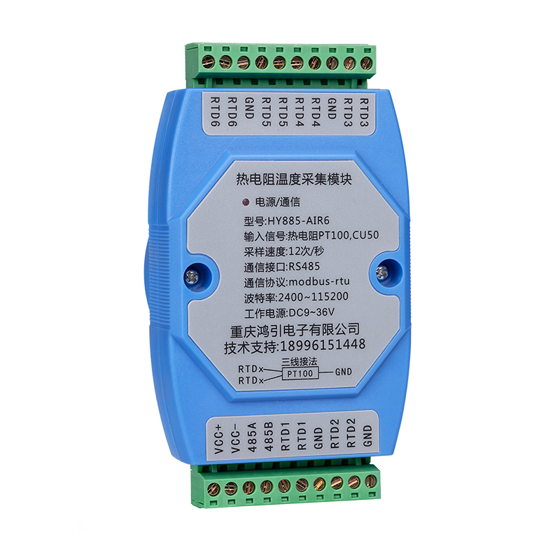 測量6路熱電阻溫度信號,通過RS485接口輸出。熱電阻信號輸入與工作電源、RS485之間隔離。RS485通信采用標(biāo)準(zhǔn)modbus-rtu協(xié)議,可與各種組態(tài)軟件,PLC,觸摸屏聯(lián)網(wǎng)。出廠預(yù)設(shè)RS485通信參數(shù):模塊地址1,波特率9600,8個數(shù)據(jù)位,無校驗位,1位停止位,用戶通過上位機(jī)參數(shù)設(shè)置軟件修改通信參數(shù)。
